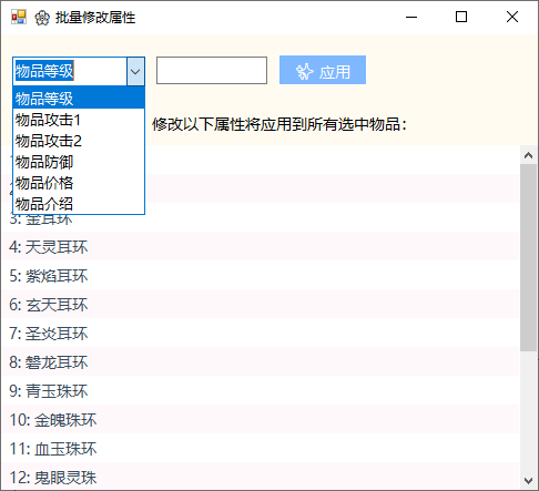 ID、名称、描述、等级、攻击、防御、价格、重量、职业限制、阵营限制等