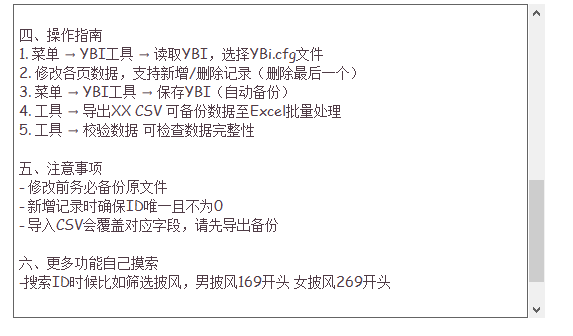 ybi工具.exe,首次使用建议先阅读工具内的使用说明.txt。 - 修改配置前请务必备份原始 YBI 文件!
