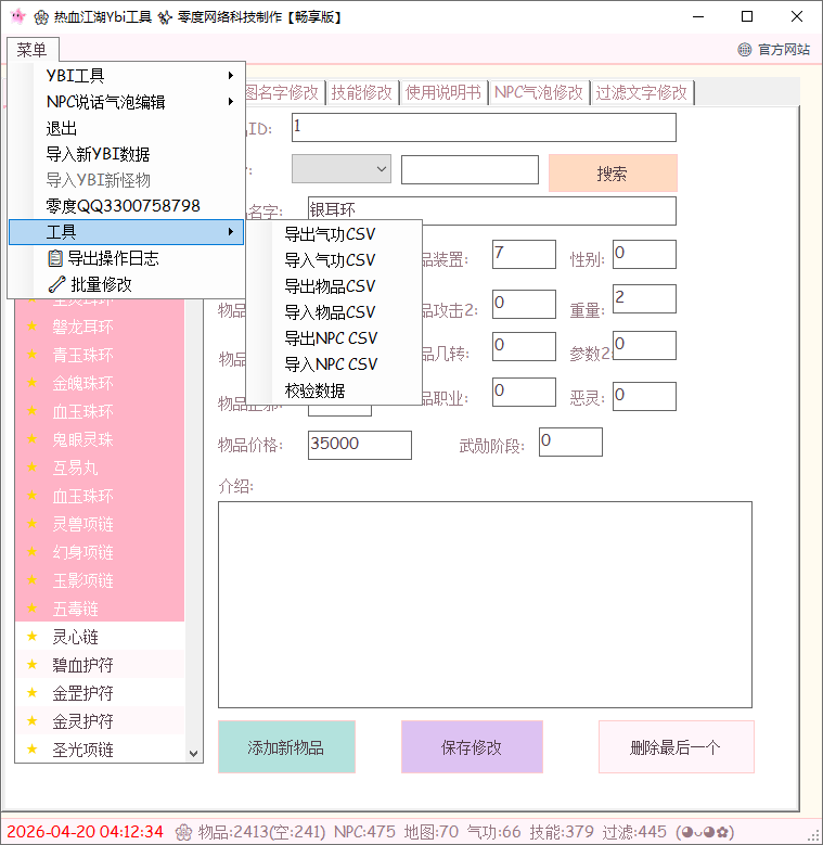 热血江湖 YBI 配置编辑器 · 畅享版 是零度网络科技独立开发的一款 Windows 可视化工具,用于解析和修改热血江湖服务端中的 YBI 配置文件。彻底告别手动解密、十六进制编辑的繁琐操作,让开服 GM 和爱好者能够安全、高效地调整游戏物品、NPC、怪物等核心数据。